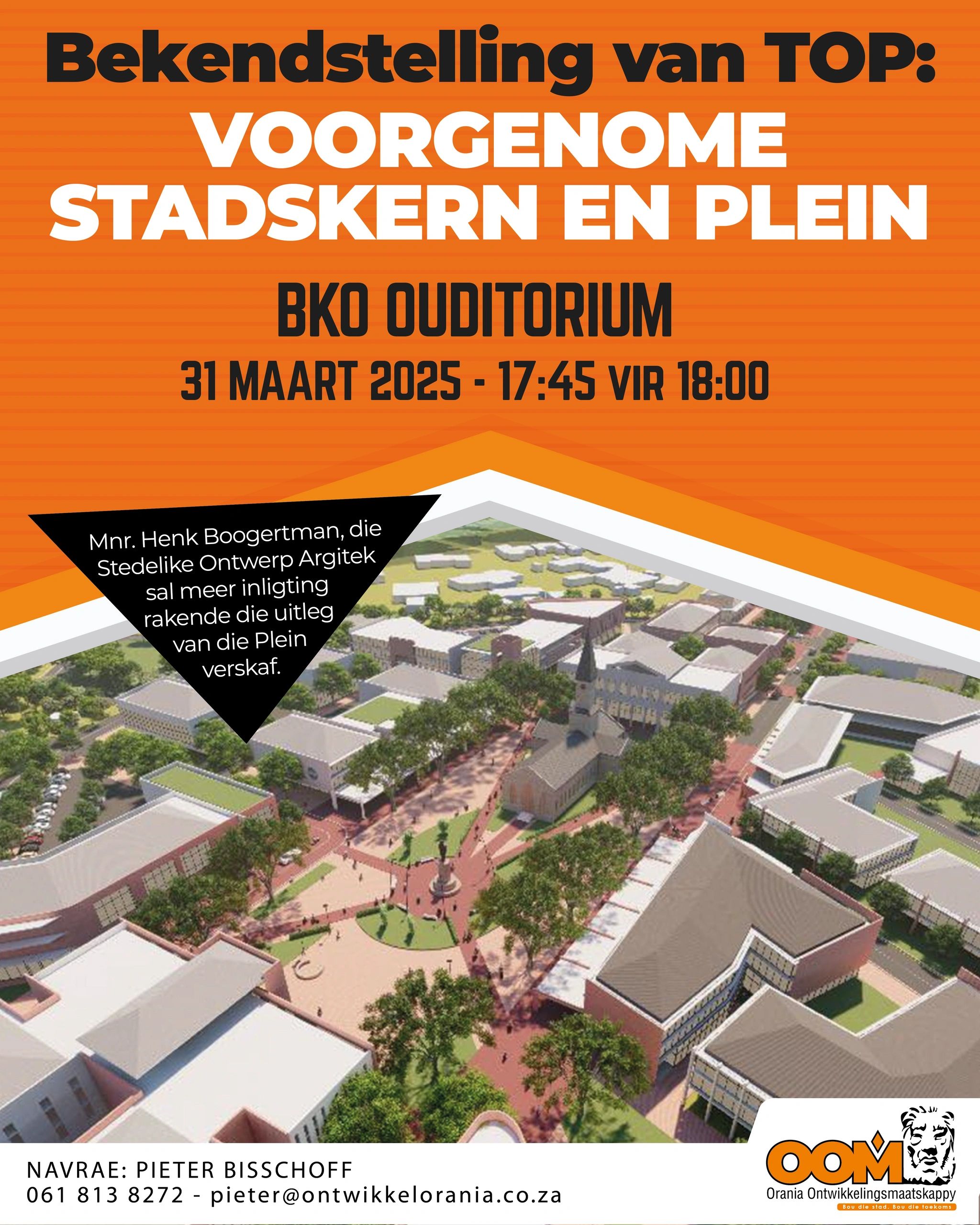 Opsomming : ‘n Gespreksgeleentheid word gehou op 31 Maart, waar inwoners vir die Orania Ontwikkelings Maatskappy (OOM) en hul argitek vrae kan vra oor die beoogde nuwe stadskern en plein.