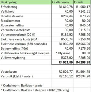 1. Die vaste maandelikse kostes in Oudtshoorn is R840.99 (42.8%) duurder as in Orania. Hierdie sluit ons heffings vir o.a. veiligheid, rouwater en die battery in, wat glad nie in Oudtshoorn van toepassing is nie.