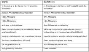 ‘n Praktiese en sosiale vergelyking tussen Orania en Oudtshoorn is opgesom in die aangehegde tabel.
